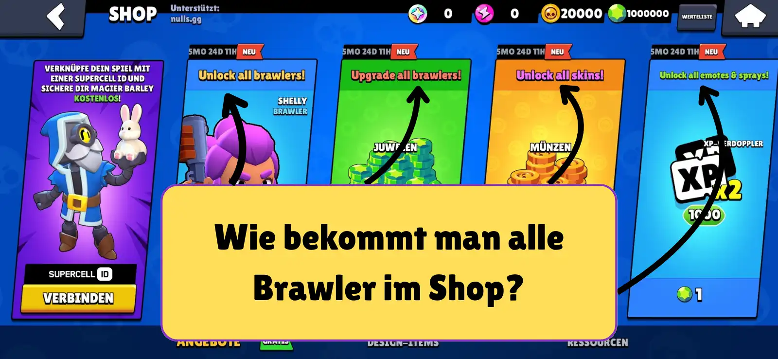 - “Unlock all skins”: Freischaltung sämtlicher visueller Charaktervariationen für individuelle Gestaltung deiner Brawler.